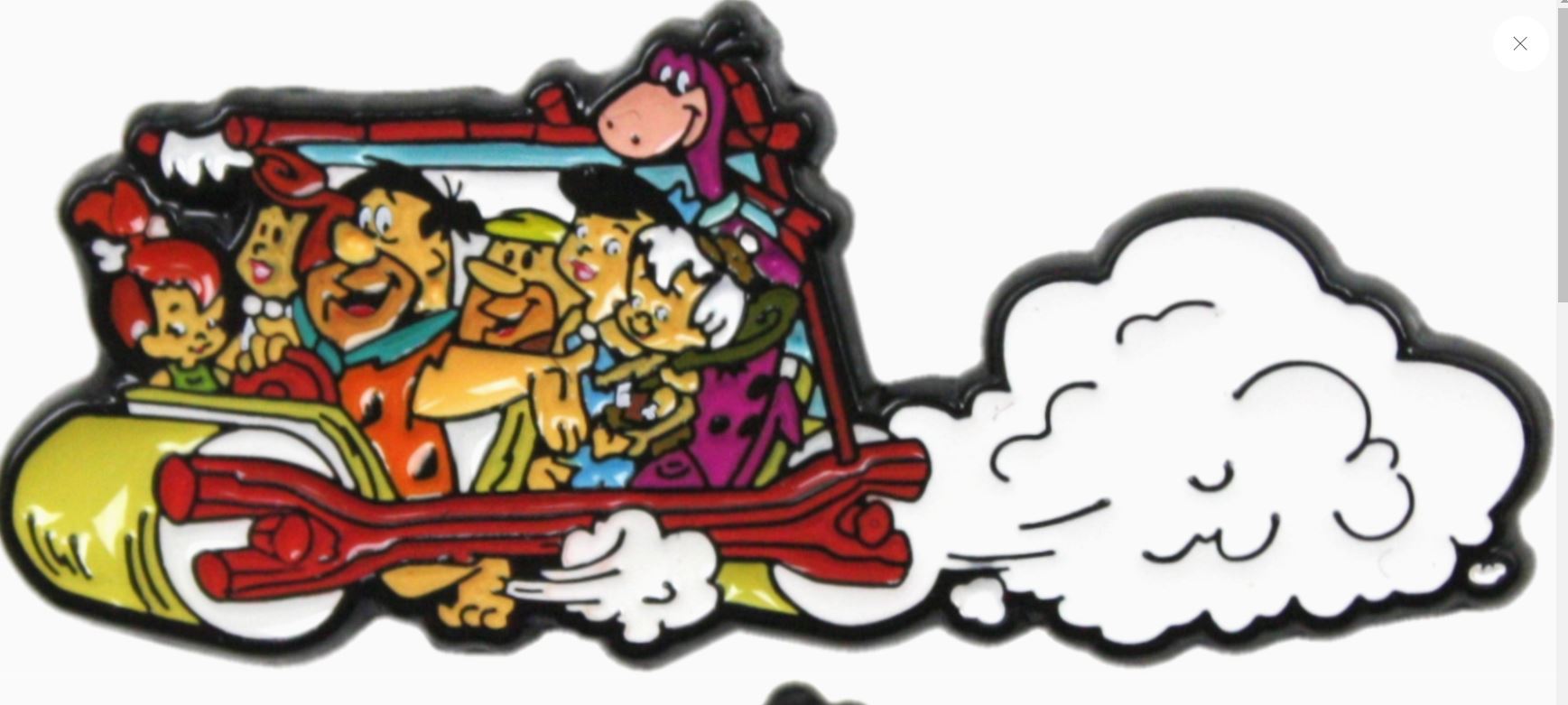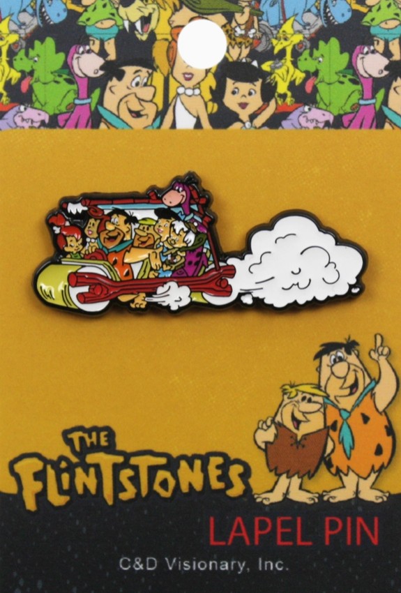 Dieser offiziell lizenzierte Emaille-Pin zeigt die gesamte Feuerstein-Bande, die in ihrem steinzeitlichen Familienauto davonrast,